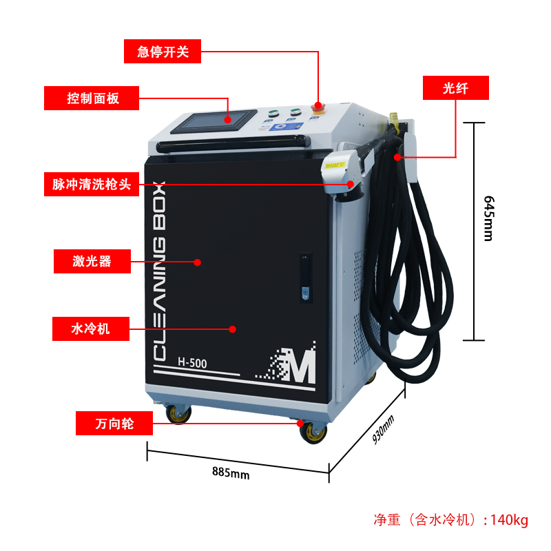 500W脈沖激光清洗機是多模平頂光斑的主力機型,性價比高,適用于中輕度銹蝕、薄漆、油污及焊縫處理,是現場維修、中小工件清洗的“萬金油”選擇。如果你要對付重度厚銹或大面積厚漆,請加預算上1000W+。